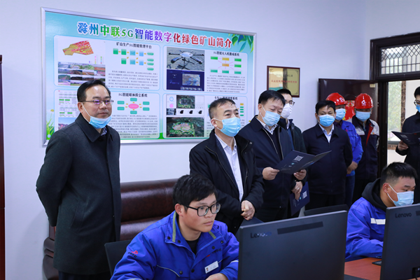 3月17日下午,中国建材股份有限公司党委委员、副总裁、中材矿山建设有限公司董事长张金栋一行莅临滁州中联黄槽坊矿山视察指导工作,滁州中联水泥有限公司党委书记、总经理刘晓俊率党委成员、兖州中材建设有限公司副总经理颜景祥及相关领导全程陪同。  张总一行领导深入矿山现场,听取了关于绿色矿山建设的相关汇报,实地检查了矿山开采作业、车辆运输、安全设备运行等相关情况。刘总向张总汇报了矿山开采近期规划,并展望矿山未来发展。  随后,张总一行参观了5G智能控制室,听取了关于5G智能数字化绿色矿山建设情况的相关汇报。  本次张总一行领导莅临黄槽坊矿山视察指导,既肯定了现阶段矿山建设取得的成绩,又指明了矿山下阶段的发展方向。