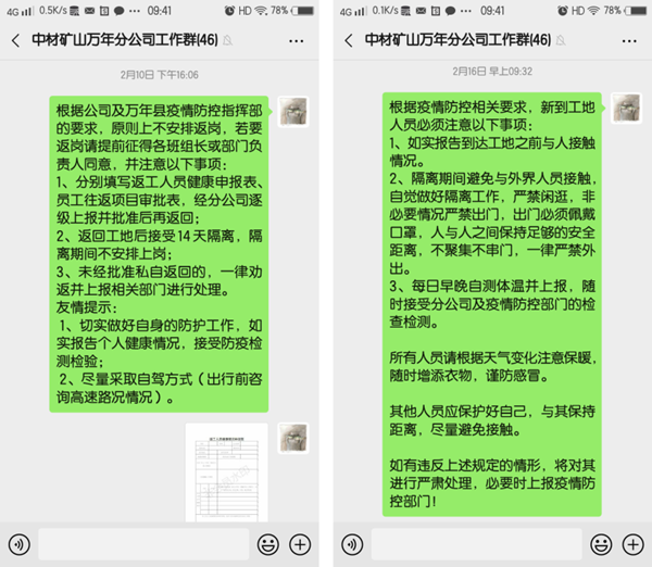 根据疫情发展及疫情期间的工作安排,遵照国家各部门、业主及公司的相关要求,分公司安排重要岗位员工返回工地,采取严格的防控措施,对返回人员进行不少于14天的隔离观察。 一、规范职工返工前的审批流程; 1、返工人员返回前须确保身体健康,无异常情况; 2、将拟返程日期、方式、路径、同程人员等信息上报登记; 3、征得业主及工程所在地疫情防控部门同意后,上报公司批准; 4、公司批准后员工本人持身份证到所在地辖区疫情防控部门开具健康证明; 5、办理员工所在地、工程所在地、公司及业主疫情防控部门需要的各种材料; 6、填写返工人员健康情况申报表; 7、分公司对以上材料进行详细审核; 8、分公司审核通过后将材料报送至各相关部门再次审批; 9、以上手续齐备齐全,方可返回工程所在地; 10、返回工地后进入隔离程序。  二、交代返岗员工路途注意事项,提高员工防护意识; 分公司要求所有返工员工路途佩戴好口罩,积极配合沿途疫情防控部门的检查检测,尽量减少路途逗留,避免与人接触。  三、严格做好员工的隔离工作; 调整宿舍安排,安排单人单间或同车返回两人一间为最小隔离单位,与其他人员宿舍、食堂等公共区域保持距离,在隔离宿舍门口设置显著的隔离标识,一律严禁外出,保证隔离切实有效。 为每名返回人员发放口罩、水银体温计等个人防疫用品;每日不少于两次自测体温,办公室负责登记上报;在自测体温的基础上,镇卫生院的医护人员每日为所有返回人员测量体温;安排专人对隔离区域进行每日不少于两次的消杀防疫;要求被隔离人员将饭菜打回宿舍食用,不得聚集用餐。 虽然现阶段各级部门调低了应急响应级别,分公司绝不会降低思想重视程度,我们将全力以赴,抓住“外防输入、内管集聚、紧抓重点”三大关键环节,在做好疫情防控的前提下,做好安全生产工作。 |