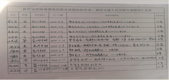 8、我们做了员工排查,建立返岗人员登记制度对返回人员登记,每天微信群详细记录职工身体状况、假期外出情况、与重点疫区人员接触情况等信息;对每名员工近14天的去向进行排查;对来自或去过疫情重点地区的员工建立重点监控清单,规劝其留在当地暂不复工,鼓励员工延迟上班;对来自或去过疫情重点地区的员工排查其抵达时间,按规定落实医学观察、隔离等措施,确保其隔离观察14天并经体温检测正常、无不适症状后方可上岗。进入岗位工作前自觉接受体温检测,体温正常方可进入工作区,并洗手消毒。严格执行各项疫情防控要求,建立和落实复工上岗前个人防护知识培训,多种方式普及传染病防护知识,做到有症状早发现、早报告、早隔离、早治疗。