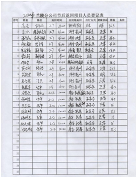 配合当地政府体温监测 落实措施,扎实开展防控工作。分公司设立疫情防控点,配备防护口罩、手套、防护镜、体温计及测温枪、酒精、84消毒液、喷雾器等防护物资。严格控制返程人员,对居住或经过疫情防控重点区域人员,要求暂不返回项目部,居家隔离自我观察;要求返回项目部人员,返程路上严格落实个人防控措施,制定记录表,对返回人员严格检查、登记;返回项目部后,在项目部内自行隔离14天,每天早晚测量体温并做好记录。    返程人员登记 每日体温监测 集中开展项目部卫生消毒工作。分公司通过多种渠道,购进酒精、84消毒液等药品,每天上午下午各进行一次集中消毒工作,办公室、会议室、厨房、餐厅、宿舍、卫生间、走廊、院内边边角角,全面消杀。  项目部消毒 消毒记录