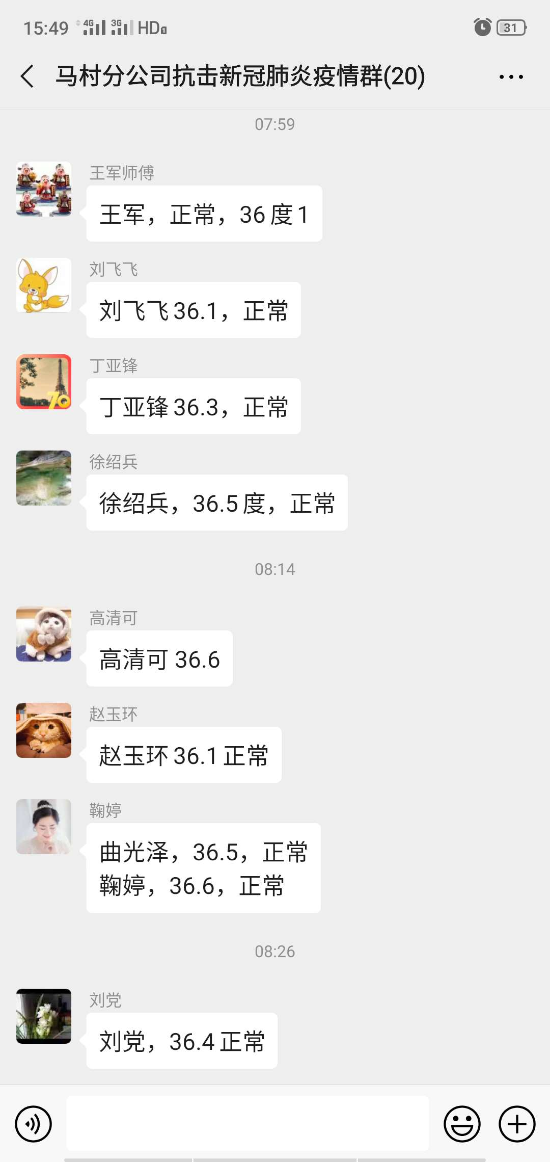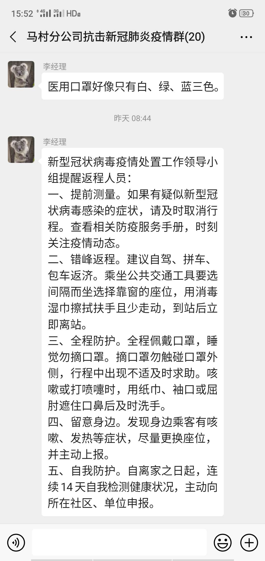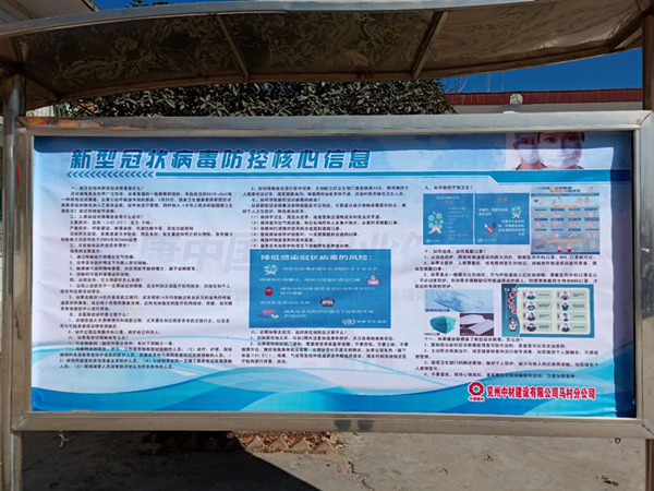 突如其来的灾难让本该举国同庆的春节变的人心惶惶。为打好这场保卫全国人民的硬仗,2020年1月25日前后,全国30多个省启动重大突发公共卫生事件一级响应,实行最严格的科学防控措施。同时各地方政府也出台相应的防控的举措。 为有效控制疫情的传播,针对疫情期间的各项工作安排,兖州中材马村分公司于2020年1月29日成立应对疫情工作领导小组。根据省委、省政府及公司关于做好疫情防控的重大决策部署,全面落实分公司的相关工作要求,负责与分公司上级及地方、千业水泥疫情工作的联系,协调好疫情期间的人员以及各项工作安排。 假期期间,通过网络通讯设备进行安全防疫宣传教育。  通过宣传栏、条幅等向员工传达疫情防控知识,提高疫情防控意识。   通过有效途径采集各类防疫物资,主要包括医用酒精、84消毒液、一次性口罩、便携式喷雾瓶以及测温仪等。    通过对办公室、走廊、宿舍以及卫生间等公共场所以及公共设备设施进行消毒,早晚各一次。  分公司门口设置岗哨,无关人员禁止出入;对相关人员进行信息登记,对进出人员进行测体温并登记,无异常才允许进入,如发现异常及时上报处理。  公司员工每天测量体温,汇报身体状况;对于外地返岗人员,按照相关规定进行相应的隔离,隔离期间每天3次汇报体温,并接受地方政府及先关人员的监督,确保万无一失。