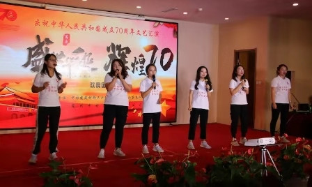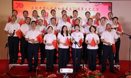 为庆祝新中国成立70周年 ,9月29日下午,由兖州中材和山东地质总队联合举办的“盛世华诞 辉煌70”国庆文艺汇演隆重举行。 一首首优美的歌声、一段段好看的舞蹈表达了对祖国母亲生日的祝福。一首《国家》,把祖国这70年来的情怀用歌曲的形式表达,祝愿我们祖国的明天会越来越好,家是国,国更是家。一首《映山红》,那优美的旋律、深情的歌词表达了对红军的热爱和对英雄的崇敬之情。一首《今天是你的生日》表达了对祖国母亲深深的热爱和祝福。本次汇演形式多种多样,精彩纷呈。包括舞蹈、合唱、独唱、相声小品、乐器独奏等。          通过本次文艺汇演增进了兖州中材和山东地质总队的友谊,展现了“不忘初心、牢记使命”主题教育的新成果,增强国庆的节日氛围,更加增强全体职工的爱国之心。 |