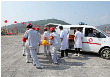 演练模拟在矿山现场1512平台,由于雨后爆堆松软,排险不及时,导致挖掘机进行挖装作业时发生坍塌事故,土石坍塌砸到驾驶室,车门无法正常开启,驾驶员被困驾驶室并且伤情不明,现场管理人员向应急指挥部报告后,立即启动应急预案,组织人员开展伤员救助。 演练开始前兖州中材吕梁分公司项目经理王建立发表讲话,并介绍了项目情况。王经理表示,吕梁分公司成立十年来一直秉承一个央企的责任,履行企业的安全管理职责,展现国有大型企业的担当。安全工作从严要求,做好企业安全形象。提升服务高度、精度和宽度,为矿山行业的健康发展贡献力量。