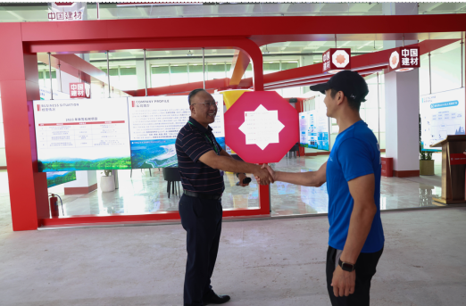 在兖州中材展厅,刘占中对企业发展历程、经营情况、品牌建设以及在矿山生产管理上取得的成绩进行了详细的介绍,邢傲伟对兖州中材的发展状况以及在积极承担社会责任等方面给予了高度的评价。刘占中表示:取得奥运冠军是中国的骄傲,走出国门为国争光是祖国以及全国人民的骄傲;作为央企,我们心中有责任,肩上有使命,将会以奥运冠军为榜样,以最大的诚信,尽最大的努力走智慧开采之路,将绿色环保的石材矿山呈现在莱州市人民的眼前。
