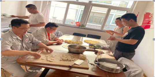 伴随着欢歌笑语忙碌了一天后,大家坐在一起吃粽子、吃饺子,喝啤酒。好酒沈醉酬佳节,十分酒,一分歌。其乐融融,像家人一样,多么和谐幸福的大家庭呀。